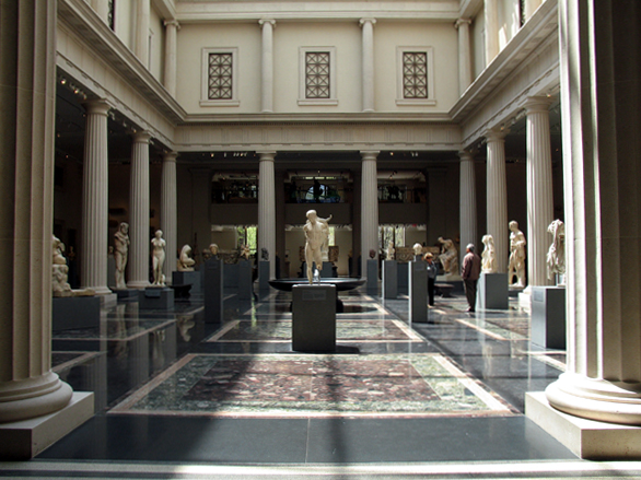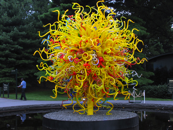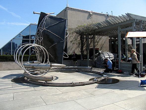 この夏のメトロポリタン屋上を飾ったインスタレーションはロクシー・ペイン(Roxy Paine: American,1966-)のMaelstrom(大渦巻き:2009)。2002年のホイットニー・ビエンナーレの折に50フィートのステンレス製の木の作品をセントラルパークに設置した作家で、このニューヨーク・アートでも紹介している。自然と人工的な要素との関連が作家の継続したテーマであるが、今回の作品は樹木の形態を丹念に調べて模したステンレススチールパイプのパーツを手作業で溶接したもの。総量7トンを超えるというステンレススチールの枝々は、タイトルの通り渦巻くようにルーフの空間を占領して見えるが、重圧感を感じさせない。週末の午後のルーフで飲み物を片手に談笑する人々のにぎわいを引き立てるような軽やかさが印象的。