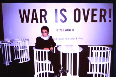 オノ・ヨーコはアーティスト、詩人、シンガー・ソング・ライターであり、彼女の活動の幅は非常に広い。 1933年2月18日、銀行家小野英輔・磯子の長女として東京で生まれた。 祖父は貴族院議員 安田善三郎であり、彼女が幼い頃戦争中であったが、優遇された一面を持っていた。 1952年学習院大学哲学科に入学。 1953年NYに移住し、サラ・ローレンス大学で作曲と詩を学び、1960年チェンバー・ストリートのロフトで発表を始める。 この頃ジョージ・マシュ-ナスと知り合い、以後、禅とジョン・ケージに影響を受けたフルクサスの活動に参加する。 フルクサスはアーティスト、音楽家、ダンサー、詩人などの集まりであり、60年代、前衛であったコンセプチュアル・アート(概念芸術)を開拓していた。 この頃の活動がアーティスト、オノ・ヨーコを形成した。
