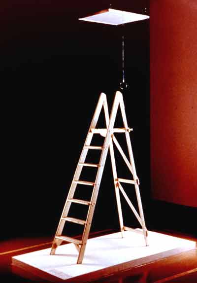 Text on paper, glass, metal frame, metal chain, painting ladder