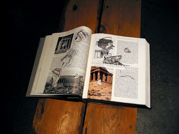 安部典子氏は、"Linear-Actions(線的な行為)”というテーマのもと作品を展開する。その行為は、ドローイングであったり、カッティングであったり。スタジオでも双方の作品が展示された。緻密な、まるで等高線のようなドローイングと、美術書や地図を抉る様にカッティングした作品。自然のモチーフをもとにその細部にこだわったドローイングが以前の作品だというが、地質学的な表現でもある今回の作品とは、小さなコスモロジー(宇宙論)ヘの関心という点でつながるのではないだろうか。