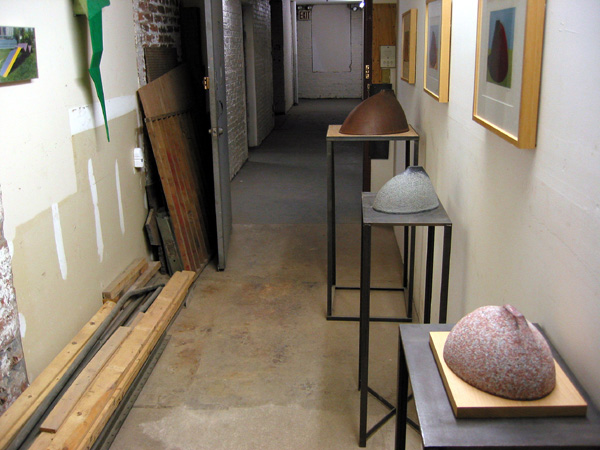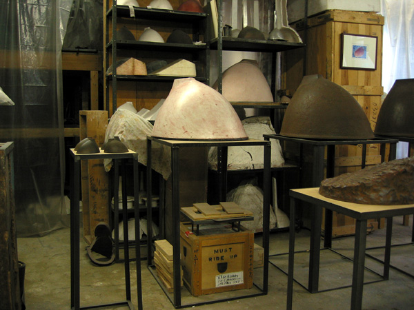 ストリートのビルディング5階にスタジオを構える。彼の初期の作品は彫刻でありながら平面性が強く、平たい鉄の面を幾何学的に構築したものだった。しかしここ数年、量感をたたえた丸味のある形に変わってきている。窓がなかった以前のスタジオから、ダンボに移り、窓に面したスタジオで制作するようになった下次氏。すると空間が見えるようになったという。同じ頃、旅先のイタリアでブルネレスキのクーポラ(円蓋)と出会い、また、日頃スタジオまでの道すがら倉庫等の搬送口の角にあるbollard(丸い緩衝器)を目にし、新しい形体が着想された。”面が丸みを持つことで、より陰影を多く生み、触角的、あるいは内蝕角的感覚を持つようになり、私自身に生命的なものに心を開くようにさせた。”とは、下次氏自身の言葉だ。