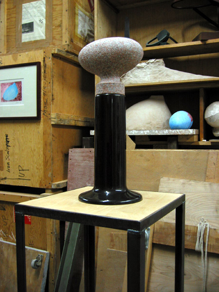 ”シリーズにも現れる。何か作品に触れたくなるような感覚を見る側にもおこす。”人の体を包み込むような空間をつくり出せるのが彫刻と絵画との違いでもある”という下次氏の最近作のコンセプトは、”大きくしたら抱きつきたくなるような作品”だそうだ。屋外での展示が考慮されている。スタジオで見せたやや小ぶりな作品群は、完成作品でありながら習作でもあり、今後広い屋外でのデビューを待っているかのようだ。