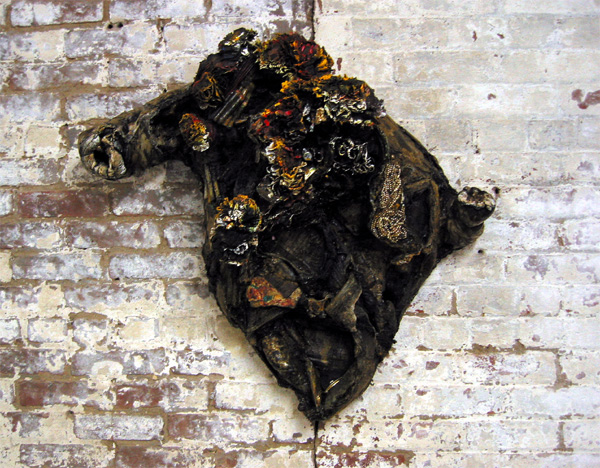 文化庁の研修員としてNYに滞在中の西成田洋子氏は、”記憶の領域”というテーマで作品を展開する。暗いアンバーな色彩、非常に有機的な形体。何からつくられているのだろうと近付いてみると、ねじ曲げられたヒールシューズがあった。女性的な要素が確かにある。日常的な廃材による過去の集積であるという。けれどもそこにはメランコリックな回顧だけが存在するのではない。”過去があるから未来がある”という彼女の作品は、未来ヘの”領域”も暗示するようだ。
