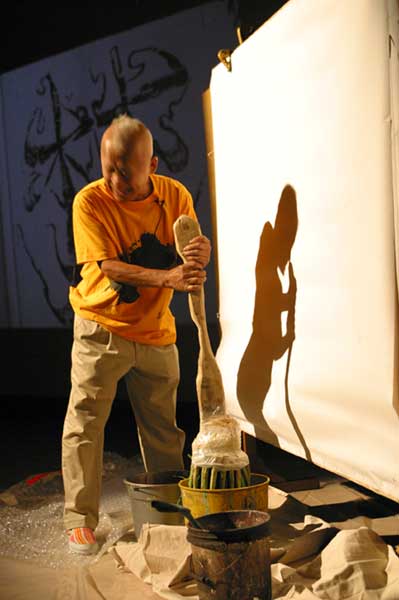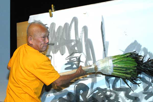 1メートルの木製の柄に、ごぼうを中心にニラ・ネギ・アスパラを巻きつけた巨大なニラ筆に墨をたっぷりエイー!と一気に一本太い線を引いた。