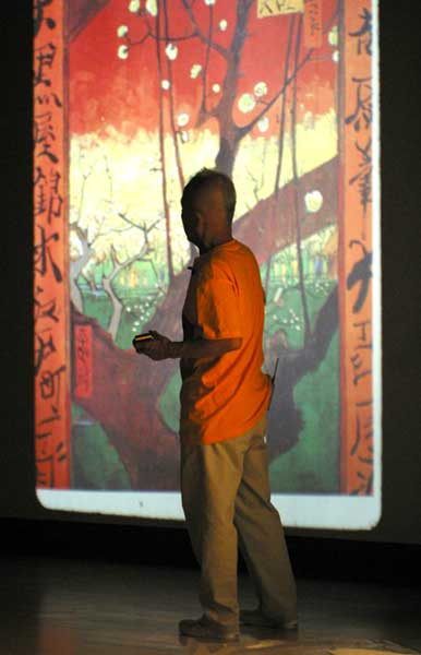 菅井・吉原・イサム・田中らの作品、又、弘法大師の梵字の自由さを説明、弘法筆を選ばづの教えを篠原流曲解にもとづき、作った大筆が凄い。