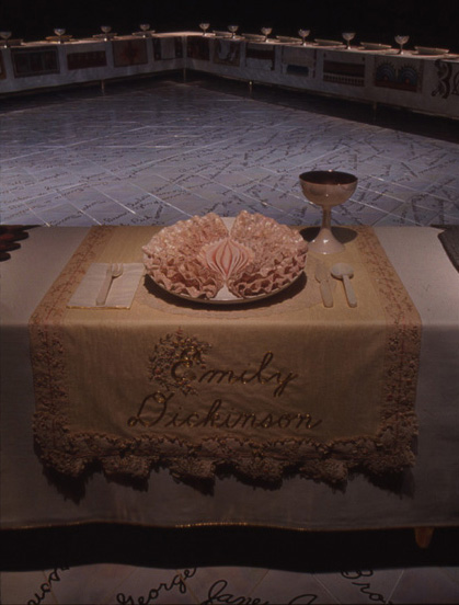 絵皿とワイングラスが並ぶ1辺13席、計39席の正三角形のテーブルは、神話や寓話に登場する架空の人物も含む、著名な39人の女性に捧げられたもの。三角テーブルの一辺は、先史時代から古代ローマ時代の女性へ、また別の1辺は中世から宗教革命時代の女性へ、そしてアメリカ革命から近代の女性革命に生きた女性へというように、作品が網羅するのは3千年以上の女性の歴史である。そこには、なじみ深いエミリー・デキンソン、ヴァージニア・ウルフ、ジョージア・オキーフの名も登場する。