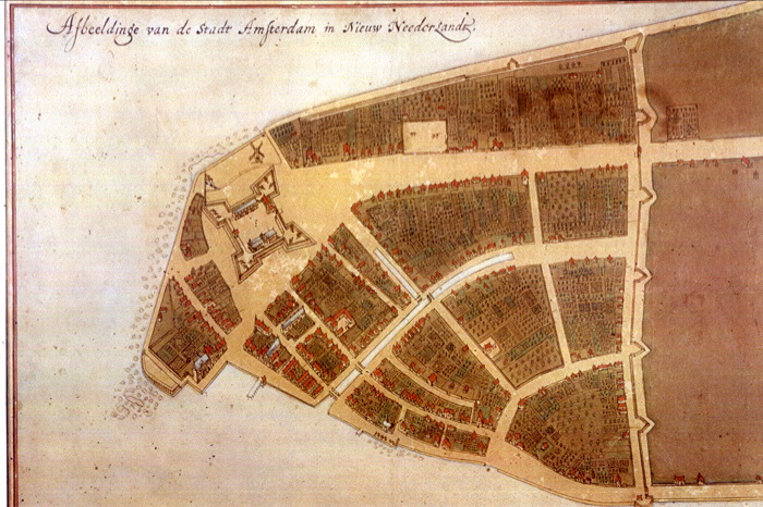 Amsterdam/ New Amsterdamの展示室はハドソンが航海に使った船の形を模している。長さは70フィート(約2キロメートル)と意外に小さな船だったらしい。ハドソンはアジアへの新航路を開拓できなかったものの、オランダは彼の発見で北アメリカの広大な地域を植民地とする。ニュー・アムステルダムと命名されたその植民地は、1600年半ばには原住民アメリカ・インデアンから主に毛皮やタバコを輸入する重要な貿易基地となる。ヨーローッパからの入植者達の数も増えるごと町の開発も行われる。本展では、入植当時の政治や経済・文化を探ることができる。展示室口近くの壁面には17世紀当時の地図の拡大図があるが、オランダの名所にちなんでつけられたニューヨークの地名が紹介されていて興味深い。例えばブロードウエイ(Broad Way)はBreede Weghから、ブルックリン(Brooklyn)やハーレム(Harlem)はBreuckelenとHaarlemからなどなど。