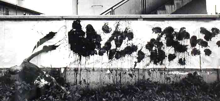リヨンビエンナーレ オープニング でボクシングペインティング・パフォーマンスをしたギュウチャン。 会場には1960年当時の参考資料として写真作品を展示。 パフォーマンスの前に、ギュウチャンと作品と撮影。 |