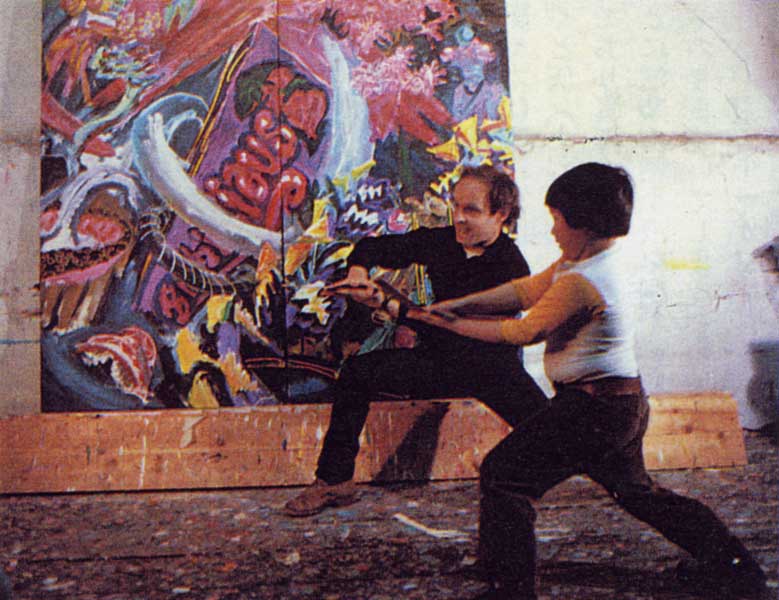 ソーホーの一郭にグランド・ストリートというのがあり、このストリート上の、展示に使えるスペースを、七ヵ所、一ヵ月間、なんとか手に入れ、中には金庫屋の店先から、中の売り物の金庫の上にまで彫刻作品を置かせてもらったり、空家を急遽手入れして、電球をつけるなど―――。無論、まともな画廊も三軒参加をよぎなくさせられ、作品の割りふりが大もめで、中でもフランス人のアランの持つ画廊は、彼の気に入った作品だけを強引に集めて並べるので、民主的でないと文句が出、僕の大作オートバイ彫刻の陰になる作家が逃げ出したりで、小規模な六〇年代のアンデパンダンを思わせる。僕ら夫婦のほかに、日本人は、頭髪を常時半分剃り落としている、クーシー増田が選ばれて参加。頑固おやじのアランの画廊のまんなかに、砂袋と丸太でヤグラを組み、全体に薄いゴムのシートをまきつけ包み、毎日定時に、クーシーが全裸でゴムの間をのたうちながら通りぬけるパフォーマンスがあり、アランは大感激でクーシーに抱きつき、キスの雨をふらせ、皆ポカンとしたり―――。とにかく一ヵ月の期間も終わりに近づき、マスコミには無視され続け、とうとう最終日を迎えてしまった。