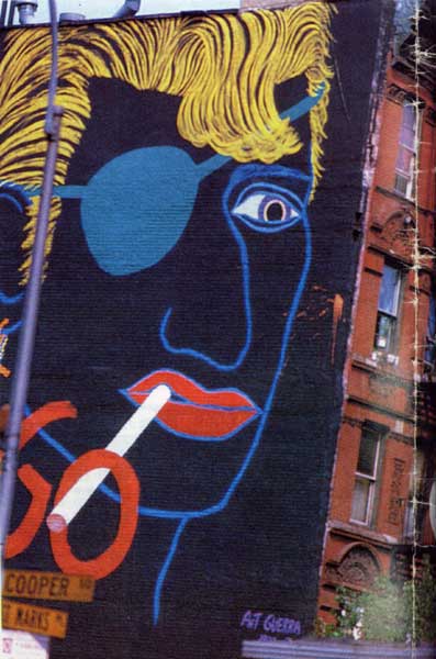 そのバーナビーが、ブーメランを山ほどかかえて、汗をかきながらコーヒー・ショップに入って来た。聞くと、自分はこれの世界チャンピオンだという。テレビ出演の時は、自分の頭の上のリンゴを、回転しながらもどって来たブーメランで切り落としたり、また日本の女子チームをきたえ、スウェーデン・チームとセントラル・パークで試合させたいとか言う。このブーメランとは、「く」の字の形の木製の飛行物体で、オーストラリアのアボリジニーが狩猟に使うのを、彼自身が改良、カラフルにデザインし、毎朝人のいない公園で、猛練習しているのである。彼は、宮本武蔵の英訳『五輪書』を熟読、投げる瞬間の呼吸を研究するほどのサムライ通で、とにかくソーホーのヘンな絵描きの一人。メキシコ生まれの絵描きで、アート・グエラというのがいる。「地獄草紙」に感動して絵を描き出した変わり者で、近作の、イースト・ヴィレッジのウォール・ペインティングは、付近にたむろするジャンキーの一人がモデルらしい。