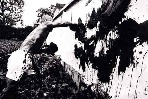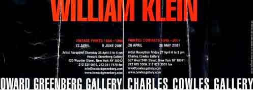 ドキュメンタリー写真の頭領ウイリアム・クラインがモスクワ、ニューヨークと評判の写真集を出版後、東京にやって来たのが1961年、ネオ・ダダグループを撮りまくり、最後に武蔵野の角、荻窪のぼくの野外アトリエでボクシング・ペインティングの撮映が始まった。ケント紙20枚をコンクリートの壁に貼り付け墨汁たっぷりしみこませたぼろ切れグローブで右から殴りつけてゆく、飛び散る黒の飛沫、マシンガンの様に、大量に、すばやくシャッターを切りまくって行くクラインは、後に友人に手紙で、「シノハラの白のスペースを黒のスミが埋めてゆくスピードと、ぼくの切るシャッターがマッチし、すばらしい一瞬だった。」と書いている。このボクシング・ペインティングの写真は、彼の代表作となり写真集を飾った。その彼が今年2001年の春、ニューヨークのソーホーとチェルシー地区の画廊で写真展を開いた。