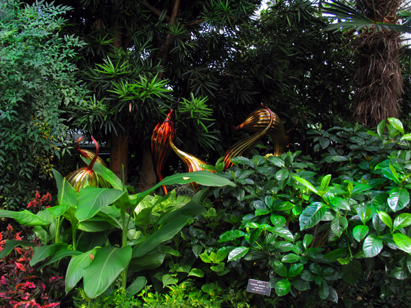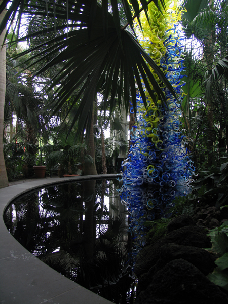 噴水や池などの水辺に設置された大がかりな作品はもとより、茂みの中にひっそりと置かれた作品を探して歩くのがおもしろい。鮮やかな色彩と独特の有機形態が特徴のチフリの作品だが,それに劣らないのがグリーンハウスの熱帯,亜熱帯の植物達。自然の強烈な色や形態にもはっとさせられる。地球温暖化が懸念される昨今、人々に自然への関心を呼び起こすためのアートとしても一役買っているのではないだろうか