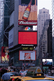 実は私の場合、この作品を4度目に漸く見れた。というのも、最初に行ったのは6時59分。朝と夕方の通勤・帰宅ラッシュ時には、作品の代わりにニュースが流れということを知らなかったのだ。2度目、3度目は同じ日に作家本人と見に行った。確か7時59分と8時59分だったと思う。二人でカメラを構えて待っていたが、自分の時計が7時59分になっても始まらない。(その時気付いたのだが、タイムズ・スクウェアに数個ある時計は皆ずれた時間を刻んでいる。)しかし全ての時計が59分を経過しても、とうとうWho’s Afraid of Blue, Red and Greenは放映されなかった。オカシイ。もう一時間待ってみよう。タイムズ・スクウェアを見下ろせるバーで時間を潰し、8時59分にまたPanasonicの下で待機した。が、それでも作品は流れなかった。