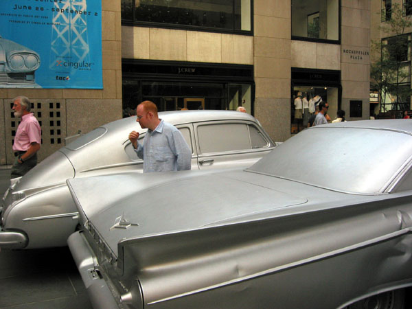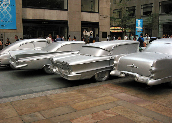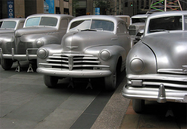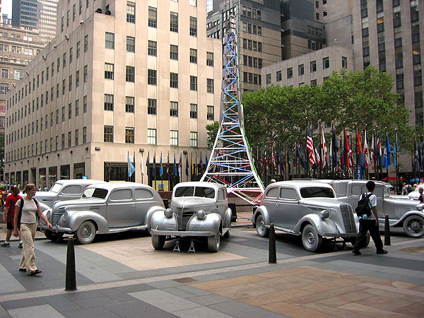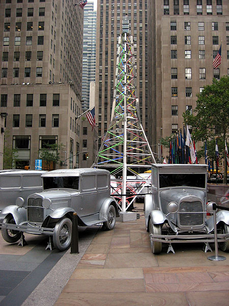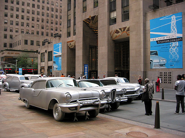 ナム・ジュン・パイクのインスタレーション、”トランズミッション”が、ロックフェラーセンター前広場で公開されている。これは、パブリック・アート・ファンドの企画によるもので、一昨年はジェフ・クーンの巨大”パピー”、昨年はルイ・ブルジョワのブロンズ製の大蜘蛛”ママン”で話題になった。これら過去の作品は、ヨーロッパですでに公開されたことのあるものだったが、パイクの作品は、はじめてファンドがロックフェラーセンターのために企画したものだ。“トランズミッション”とは、伝達、送達という意味。放送、車がその手段であるように、パイクのインスタレーションは、30フィートの電波塔とそれを取り囲む16台の車によって構成されている。