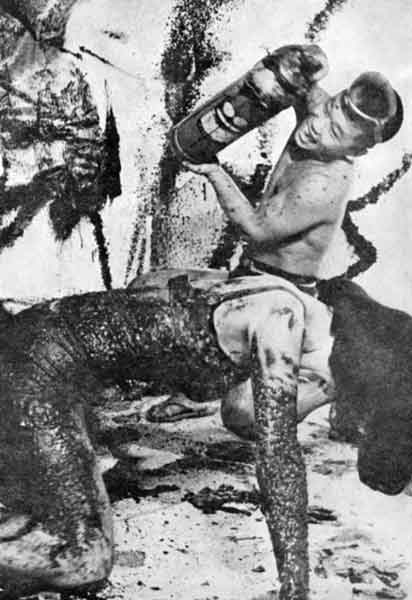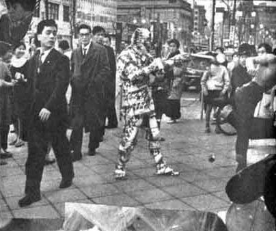 ヤコペッティーの 「世界残酷物語」 中、フランスの画家イブ・クラインのパリのモデルを使った青い人拓シーンが、この日本残酷物語の下じきであることは明白だ。 ぼくもイブ・クラインのは観ているが二番煎じだからといって嫌な気はぜんぜんしない。 ピカソが来ればピカソ流、マチウが来ればマチウ流が大流行する日本で、残酷物語の大ヒットにあやかろうと日本版を作ったとしても悪いはずがどこにある。 柳の下にどじょうは二匹いる、というのが現代の常識なのだ。